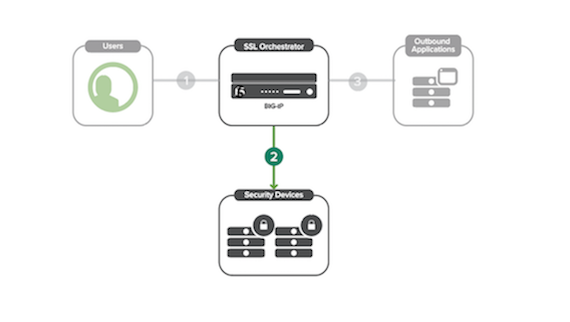 - The BIG-IP device decrypts traffic and sends it to the security devices.