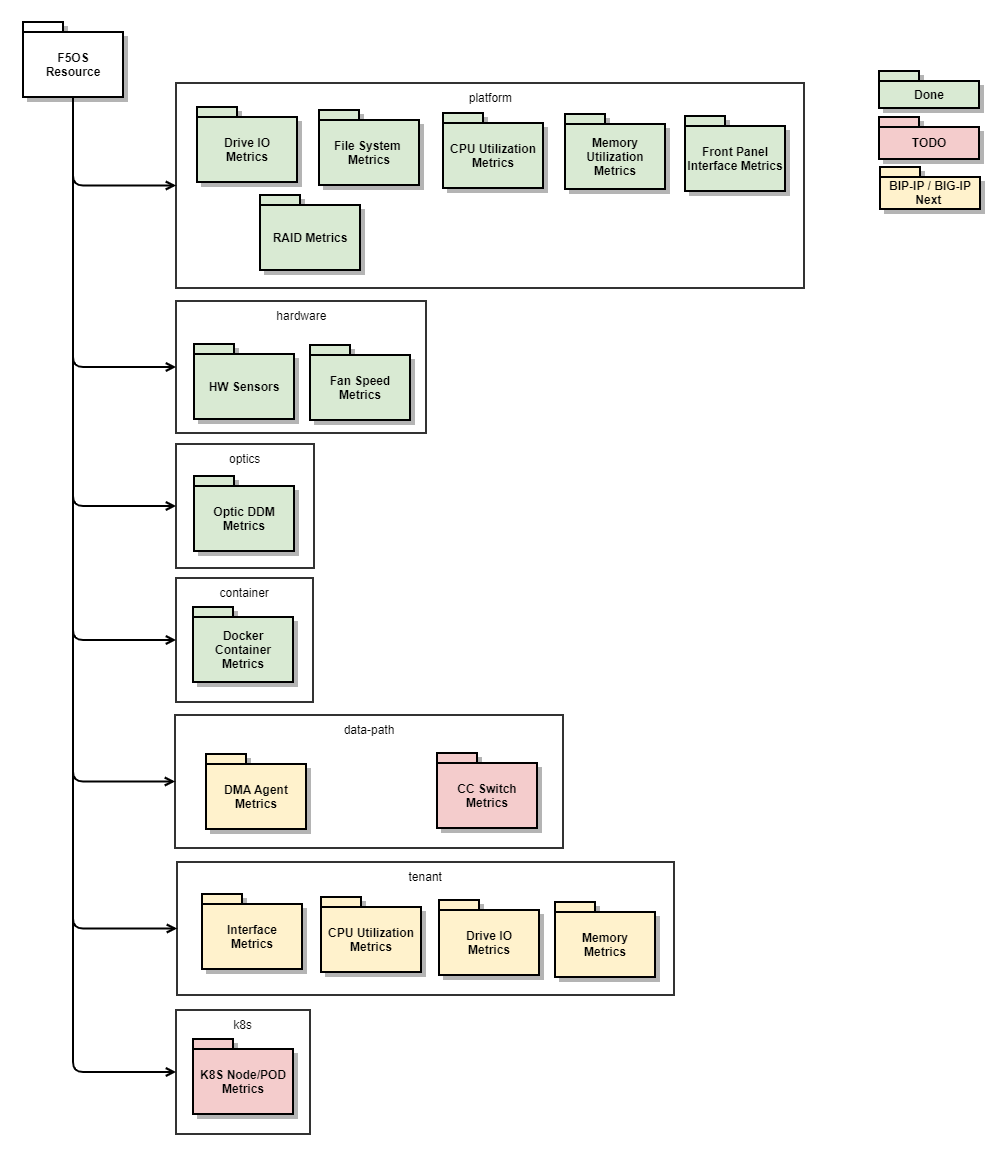 Option Description all Reports all logs and metrics produced by the F5OS platform layer logs Reports all F5OS logs file through the OpenTelemetry ’log’ API platform-log Exports the F5OS platform log through the OpenTelemetry ’log’ API event-log Exports the F5OS confd event log through the OpenTelemetry ’log’ API metrics Report all F5OS metrics through the OpenTelemetry ‘metric’ API platform F5OS platform metrics such as memory, disk, cpu, interface, file system, and RAID stats hardware F5OS hardware sensors such as voltage, current, temperature, power, fan-speeds optics F5OS front-panel Optic DDM metrics tenant Low level tenant reported metrics such as memory, disk, cpu, interface stats datapath F5OS data-path metrics such as those generated by the FPGA and DMA tmstat F5OS tmstat tables exported as metrics container F5OS Per-Container metrics such as cpu, block-io, network, memory -