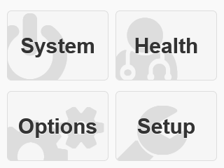 The LCD displays a splash screen by default. Tap the touchscreen to display the main menu, which displays options for navigating to the System, Health, Options, and Setup menus.