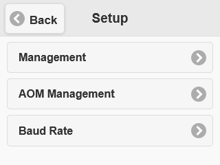 | Setup | Provides options for configuring the management interface, Always-On Management (AOM) management interface, and serial port baud rate. |
