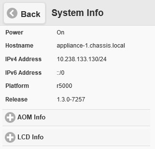 | System Info | Shows information about power state, hostname, IP addresses, platform, software version, AOM addresses and firmware, and LCD firmware version. This is disabled for security purposes when the LCD user interface is in Secure Mode, as indicated by a padlock icon. It is also disabled when the current state of Secure Mode is unknown. |