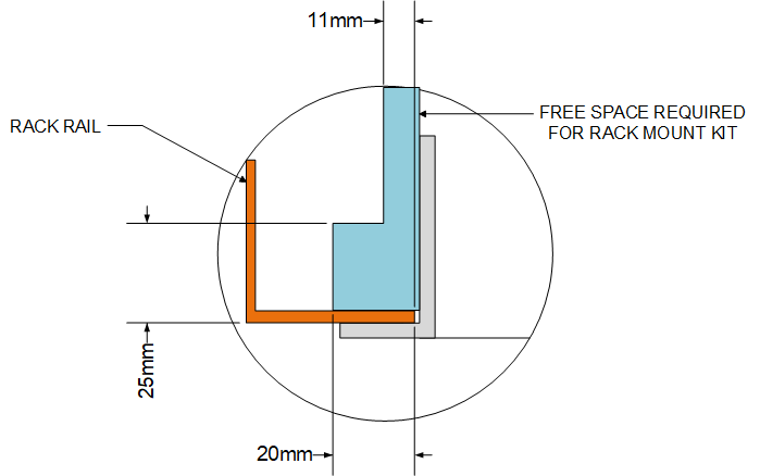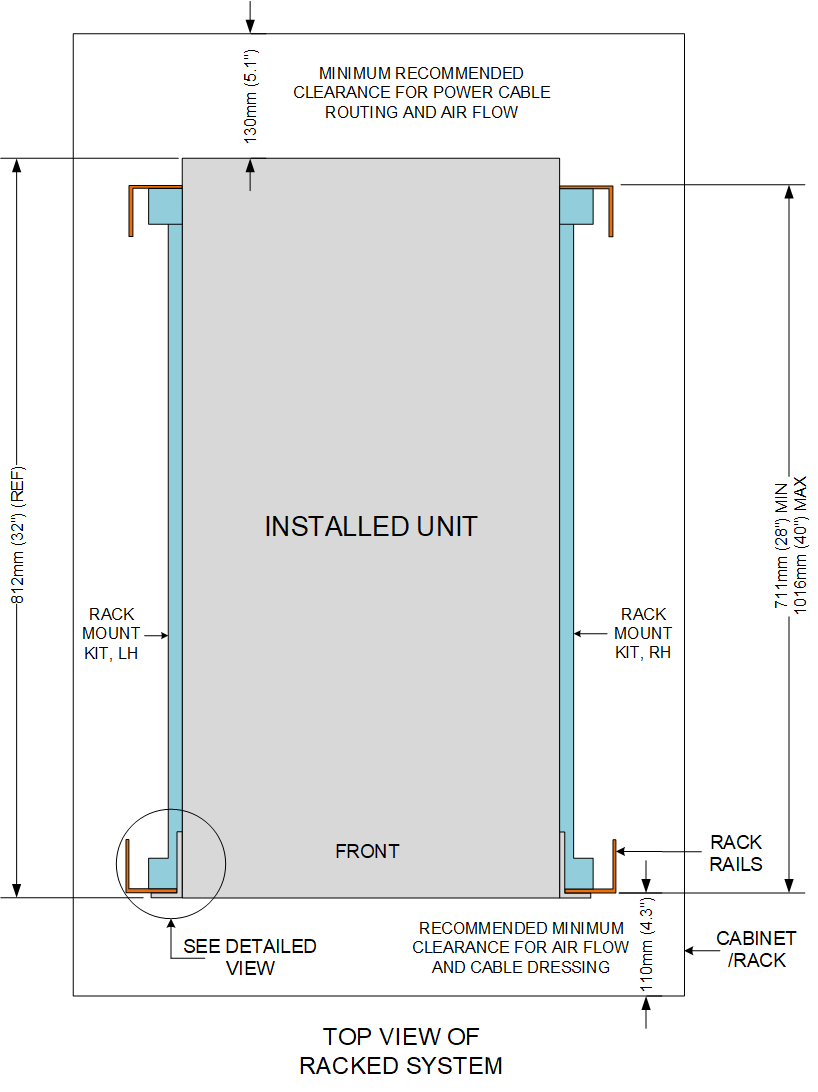 The VELOS Series platforms ship with a rack mount kit to help install the system more easily. This kit requires that the rack or cabinet has certain clearances and spacing, as shown here.