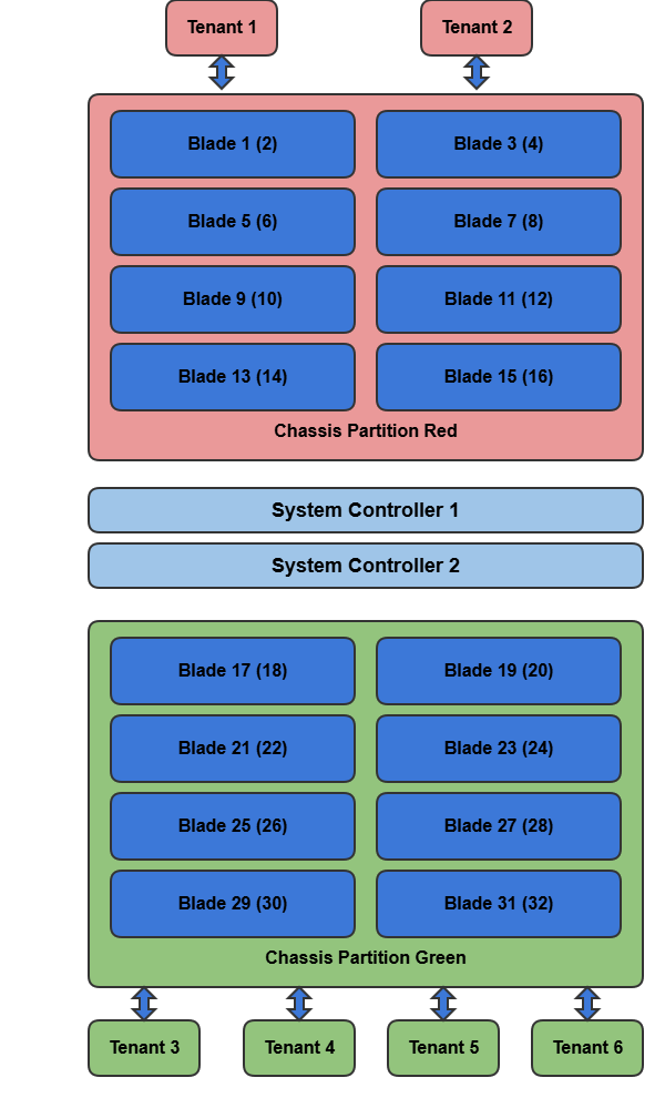 In the figure, the Red and Green chassis partitions each span eight blades and one has two tenants and the other has four tenants residing on them, respectively. The Red chassis partition spans eight blades and has two tenants, Tenant 1 and 2, on it. Tenants 1 and 2 are handling a large amount of traffic and require more bandwidth and more processing power than the other tenants.