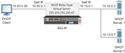 For example, a DHCP client sends a broadcast message to the destination IP address 255.255.255.255, which is the destination address configured on the virtual server. A DHCP type virtual server automatically uses port 67 for an IPv4 broadcast message or port 547 for an IPv6 broadcast message. The BIG-IP virtual server receives this message on the VLAN with self IP address 10.20.0.1 and relays the DHCP request to all DHCP servers: 10.10.0.3 and 10.10.0.7.